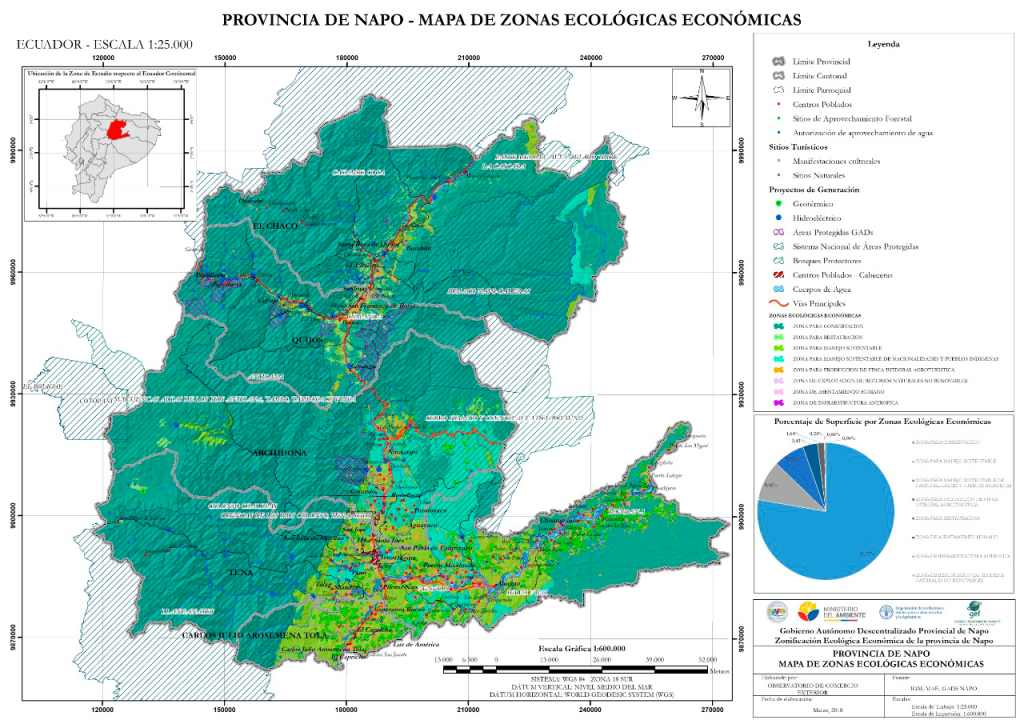 Durante el mes de mayo de 2018 se realizó la entrega del mapa de Zonificación Ecológica Económica ZEE para la provincia de Napo. Este producto busca que la implementación de una ZEE sea el insumo para la actualización del PDOT de la provincia como estrategia más adecuada para ajustar las necesidades del GADP Napo para dar cumplimiento a las expectativas del Plan Toda una Vida y los Objetivos de Desarrollo Sostenible (ODS), guiando el uso del territorio de una manera sostenible.